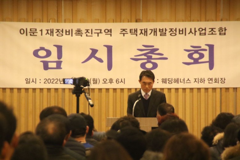 [세계타임즈 백진욱 기자] 지난 19일 오후 6시 동대문구 이문1구역 재정비촉진구역 주택재개발정비사업조합이 관내 웨딩헤너스 지하 연회장에서 350여 명의 조합원이 참석한 가운데 순조롭게 긴급 임시총회를 마무리 했다.