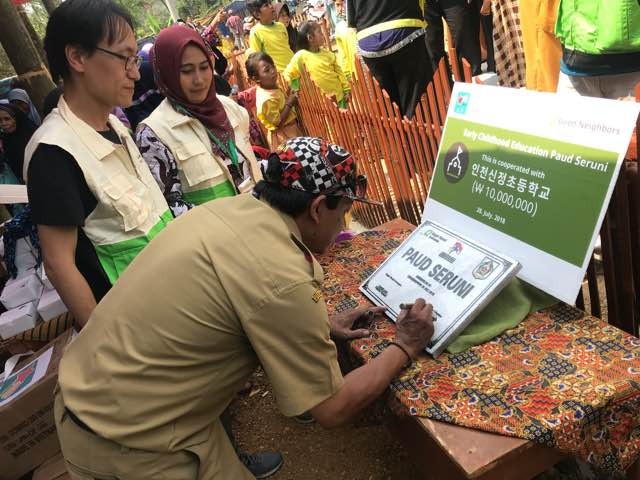 인천신정초등학교는 교직원들 및 학생들과 함께 해당 사업을 위해 자체적인 모금활동을 통해 1천만 원의 기금을 조달하였으며 이를 굿네이버스 인도네시아(지부장 최용기)에 전달하였다.