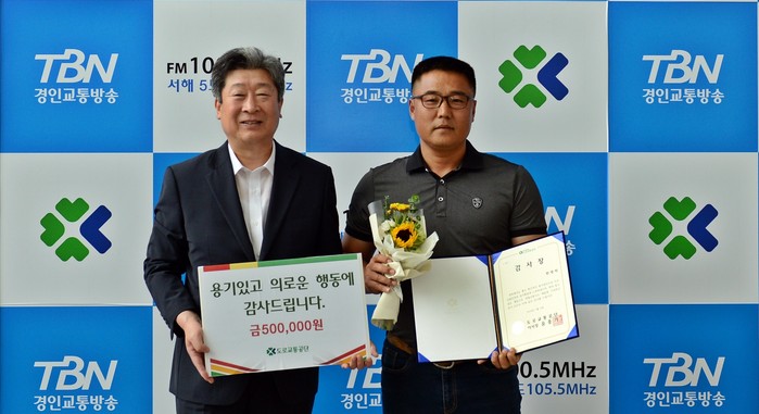 | ▲ 2일 인천 남구 TBN경인교통방송에서 윤종기 도로교통공단 이사장(왼쪽)이‘투스카니 의인’ 한영탁씨(오른쪽)에게 감사장을 전달 후 기념촬영을 하고 있다. |