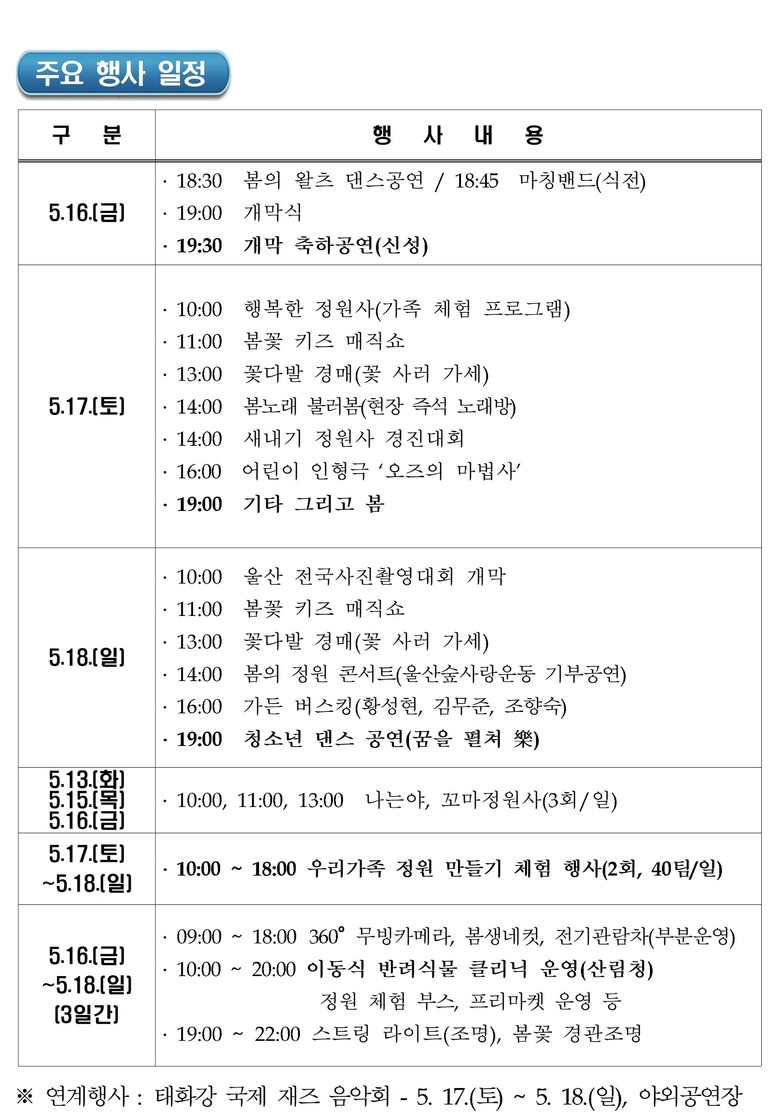 이 밖에 태화강 국가정원 시화전을 비롯해 태화강에 자생하는 야생화 분재 전시, 프리마켓, 봄꽃을 배경으로 인생네컷(포토존), 이동(무빙)카메라 운영 등의 행사도 진행된다.