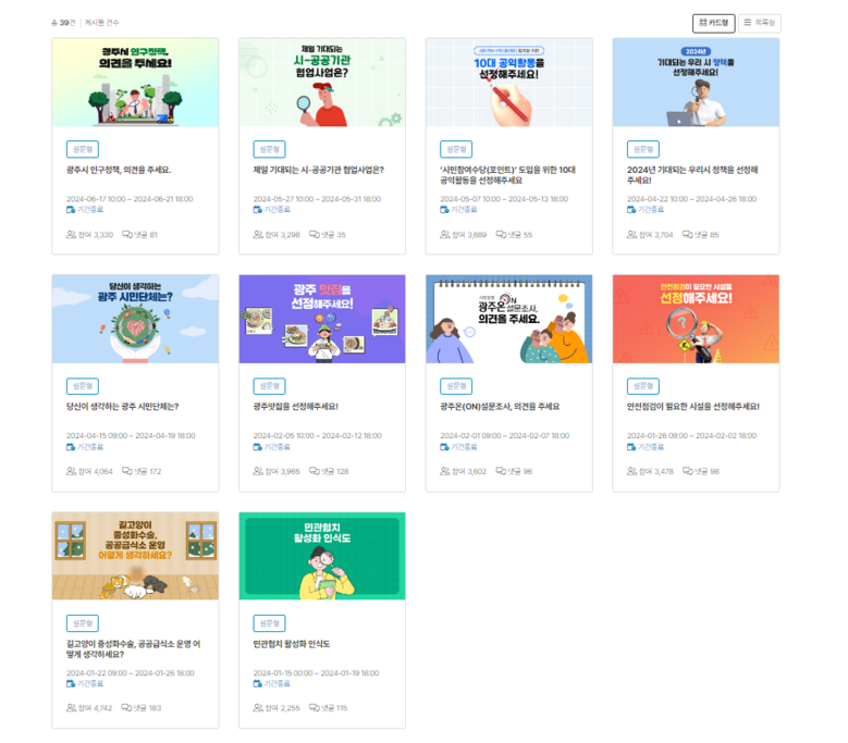 광주광역시(시장 강기정)는 ‘광주온(ON)’ 온라인 설문조사를 지난 2022년 12월 ‘가뭄 대책·물 절약 실천 관련 의견수렴’을 시작으로 2024년 7월 현재까지 38차례 진행했다. 이 가운데 27건의 설문조사 결과를 정책에 반영했다.