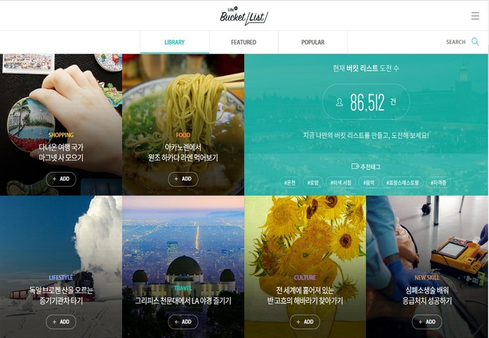 ‘버킷리스트’는 한화생명이 새롭게 선보인 라이프스타일 컨텐츠 플랫폼으로 세계여행, 스포츠, 라이프스타일, 컬쳐, 푸드, 아웃도어, 쇼핑 등을 버킷리스트화 해 제공한다. 실제 도전할 수 있도록 실용적인 팁과 노하우를 일목요연하게 구성하고, 효과적인 텍스트 배치와 과감한 이미지 중심의 디자인과 UI를 구현하여 마치 패션잡지를 보는 것과 같이 집중도를 높인 점이 우수하게 평가됐다.