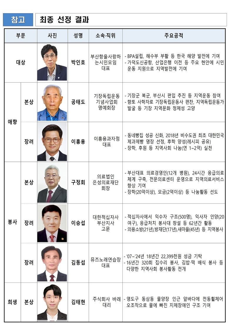 ○ [봉사 부문] ▲‘본상 수상자’ 구정회 의료법인 ‘은성의료재단’ 회장은 30여 년 의료분야에 헌신하며 24시간 응급의료 체계 구축과 전문의료센터 운영을 통해 영남권 중증 환자 대응력 강화에 기여하였다. ▲‘장려상 공동 수상자’ 김동섭 ‘뮤즈노래연습장’ 대표는 2009년부터 320회에 걸친 주거환경 취약 가구 집수리 봉사, 독거노인 대상 김밥 배식 등 봉사활동으로 귀감이 되고 있다. ▲‘공동 장려상 수상자’ 이승섭 ‘대한적십자사’ 부산지사 고문은 적십자사에서 62년간 활동하며 익수자 500여 명 구조, 익사자 20여 구 인양 및 의용소방대원으로 21년간 활동하였다.