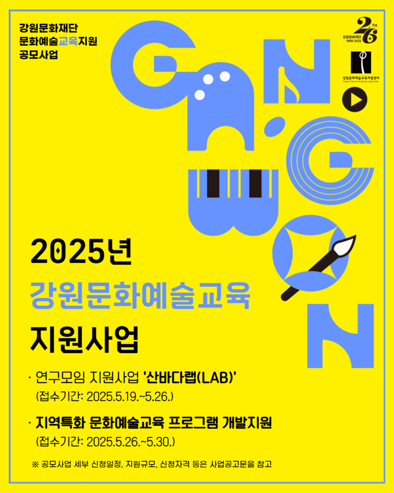 또한‘산바다랩(LAB)’은 5월 12일부터 14일까지, ‘넥스트 레벨’은 5월 19일부터 21일까지 재단 내에 상담부스를 운영한다. 사업관련 상담 예약 등 자세한 사항은 강원문화재단(www.gwcf.or.kr) 또는 강원문화예술교육지원센터(www.gwarte.or.kr) 홈페이지 사업공고문을 통해 확인할 수 있다.