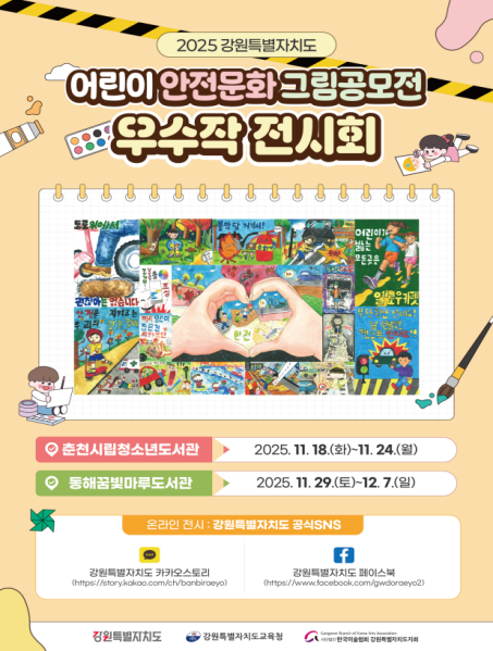 – 어린이 시선으로 그린 ‘생활 속 안전’ 작품 45점 선보여 – [강원도 세계타임즈=김민석 기자] 강원특별자치도(도지사 김진태)는 11월 18일부터 12월 7일까지 춘천시립청소년도서관과 동해꿈빛마루도서관에서 「어린이 안전문화 그림 공모전 우수작 전시회」를 개최한다고 밝혔다.