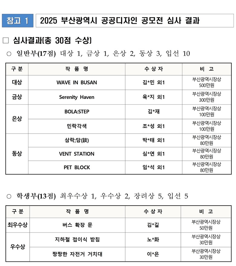 한편, 우수 디자인으로 선정된 30점의 작품은 오는 9월 24일 시민공원 다솜갤러리에서 열리는 「2025 부산사인엑스포」 내 부산 공공디자인 홍보관에 전시되며, 연내 작품집으로 제작해 배부할 예정이다.