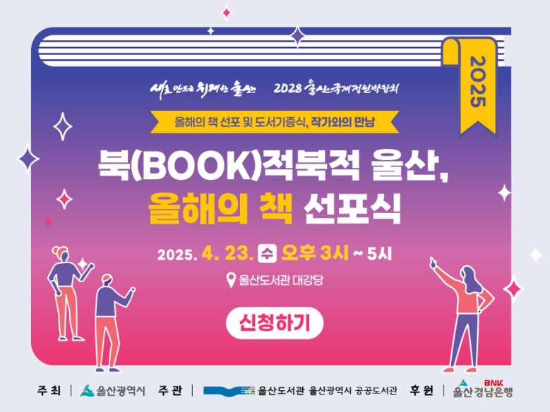 [울산 세계타임즈=이호근 기자] 울산도서관은 오는 4월 23일 오후 3시 울산도서관 1층 대강당에서 개최하는 ‘2025년 북(Book)적북적 울산, 올해의 책 선포식’ 참가자를 모집한다고 밝혔다.