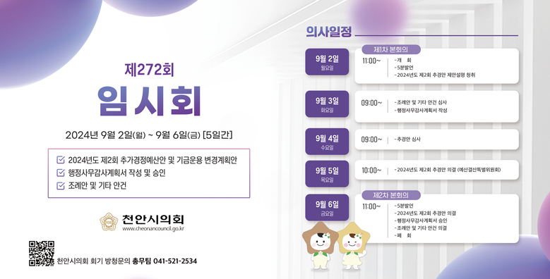 각 상임위원회에서는 ▲2024년도 일반 및 특별회계 제2회 추가경정예산안 ▲천안시 식품접객업 옥외영업에 관한 조례안 ▲천안시 어르신 생활디지털 교육 지원에 관한 조례안 ▲천안시 아동의 놀 권리 증진에 관한 조례안 ▲천안시 유아숲체험원 운영 및 관리에 관한 조례안 등의 안건을 심사한다.