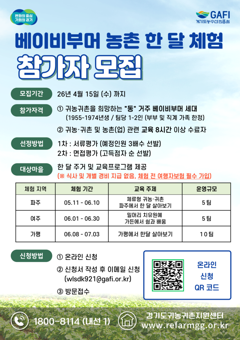 자세한 사항은 경기도귀농귀촌지원센터 누리집 공지사항 또는 전화(1800-8114, 내선 1번) 문의를 통해 확인할 수 있다.