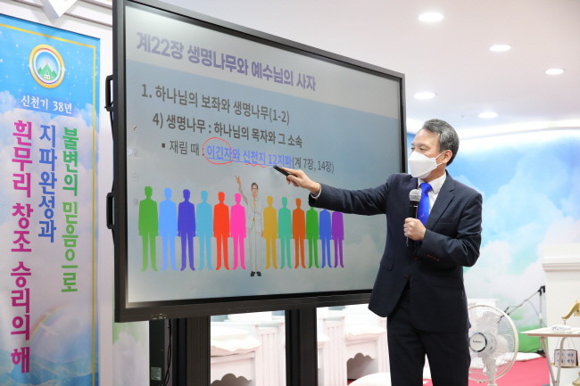 (사진=지난 23일 신천지예수교회 유영주 지파장이 온라인 신천지 말씀 세미나에서 요한계시록 22장에 대한 강의를 하고 있는 모습)