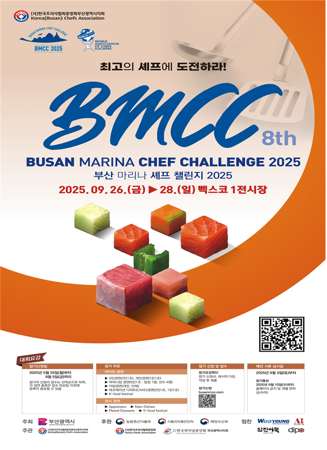 올해 8회째를 맞이하는 '부산마리나셰프챌린지대회(BMCC 2025)'는 '최고의 셰프에 도전하라'를 주제로 국내외 조리사들이 참가하여 실력을 겨루는 장으로, 시가 주최하고 (사)한국조리사협회중앙회 부산시지회가 주관한다.