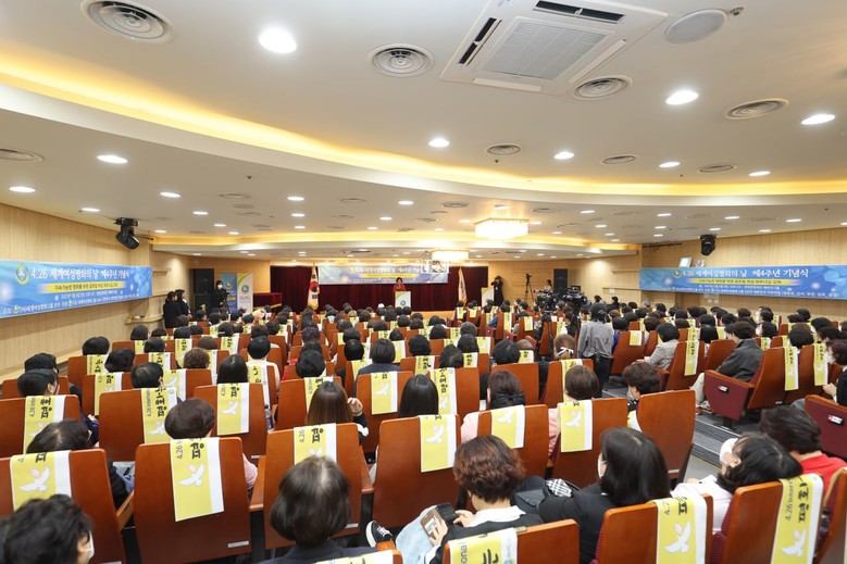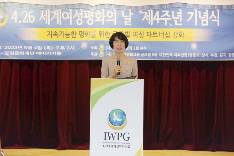 [세계타임즈 백진욱 기자] 지난 4일 오후 2시 ㈔세계여성평화그룹 글로벌 8국(IWPG, 글로벌국장 최강순)이 4·26 '세계여성평화의 날’ 4주년을 맞아 ‘지속가능한 평화를 위한 글로벌 여성 파트너십 강화’를 주제로 양천문화회관 해바라기홀에서 250여 명의 여성들이 모여 기념식을 개최했다.