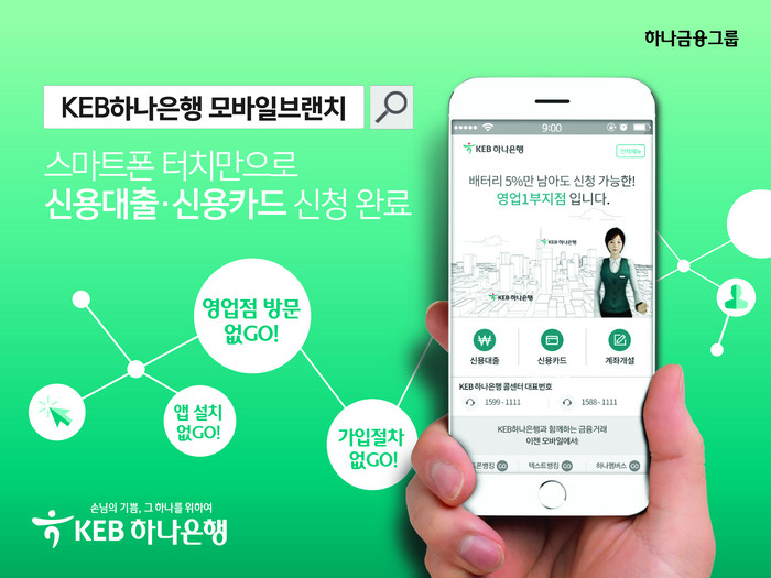 '모바일브랜치'는 KEB하나은행의 모든 영업점을 온라인 상에 구현하여, 별도 앱 설치 및 회원가입 과정 없이 원하는 영업점 앞으로 신용대출 및 신용카드 발급을 신청할 수 있는 새로운 온라인 채널이다.