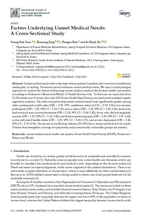 | ▲SCI(E)급 국제학술지 ‘International Journal of Environmental Research and Public Health’ 7월호에 게재된 해당 연구 논문「Factors underlying unmet medical needs: A cross-sectional study」 |