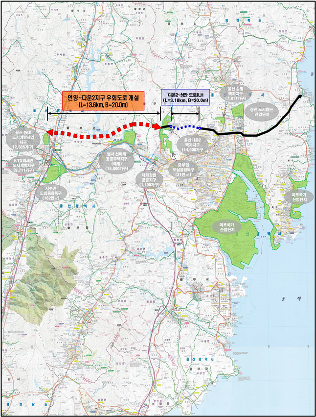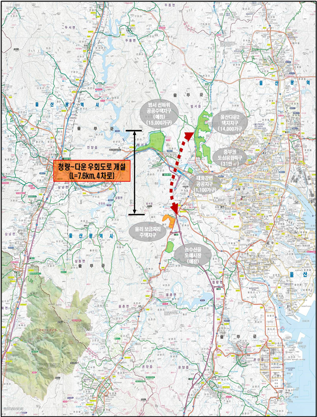 울산시는 지난 2023년 3월 ▲언양~다운(국도24호선) 신설 ▲청량~다운(국도14호선) 신설 사업을 예비타당성조사(예타) 대상 사업으로 신청했다.