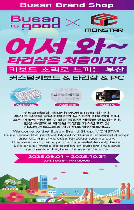 이번 반짝 매장(팝업 스토어)은 맞춤형(커스텀) 키보드 및 고급(하이엔드) 피시(PC) 전문기업 '몬스타 주식회사'와 협업을 통해 체험형 '타건 숍'으로 구현해 생활 속에서 부산의 도시브랜드를 친근하게 경험할 수 있도록 기획됐다.