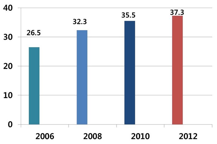 | ▲65세 이상 노인의 관절염 또는 류마티스 유병률 변화(2006~2012) |