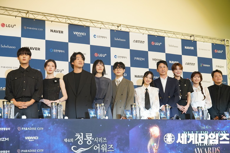 이정하, 고윤정, 안재홍, 금해나, 임시완, 박보영, 신동엽, 장도연, 윤가이, 곽준빈이 25일 오전 서울 영등포구 CGV여의도에서 열린 제4회 청룡시리즈어워즈 핸드프린팅 행사에 참석해 포토타임을 갖고 있다.