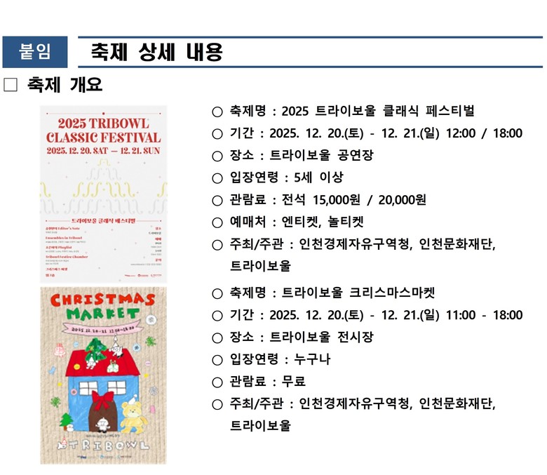 ○ 가족과 함께하는 공연관람, 크리스마스마켓 등 문화행사 소식 [인천 세계타임즈=심하린 기자] (재)인천문화재단에서 운영하는 인천 송도에 위치한 예술공간 트라이보울에서 12월 20일(토), 21일(일) 이틀간 클래식 음악 축제와 크리스마스마켓이 열린다. 이번 축제는 올해 트라이보울의 마지막 프로그램으로 2025년을 마무리하며, 따뜻하고 설레는 시간을 관객과 함께할 예정이다.