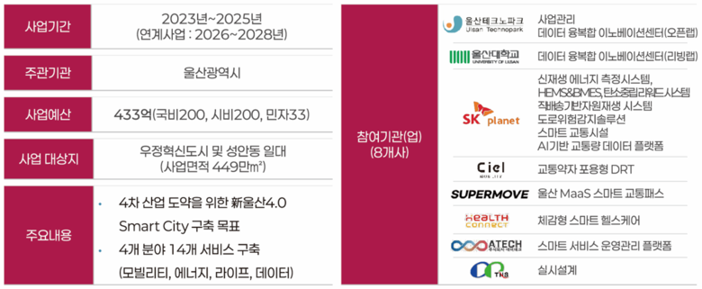 울산시 관계자는 “이번 사업 추진을 위해 지난 2023년 11월 중구청, 울산테크노파크 등 9개 참여 기관과 업무협약을 체결한 바 있다”라며, “주민들의 참여와 협조가 중요한 지역 중심 사업인 만큼 앞으로도 주민들과 적극 소통해 주민 체감형 서비스를 구축해 나갈 계획이다”라고 말했다.