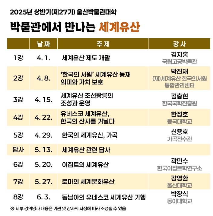 또 △4월 29일 신용호 가곡전수관 사무국장의 ‘한국의 세계유산 가곡’, △5월 20일 곽민수 한국이집트학연구소 소장의 ‘이집트의 세계유산’, △5월 27일 강영환 울산대학교 명예교수의 ‘로마의 세계문화유산’, △6월 3일 박장식 동아대학교 교수의 ‘동남아의 유네스코 세계유산 기행’으로 구성된다.