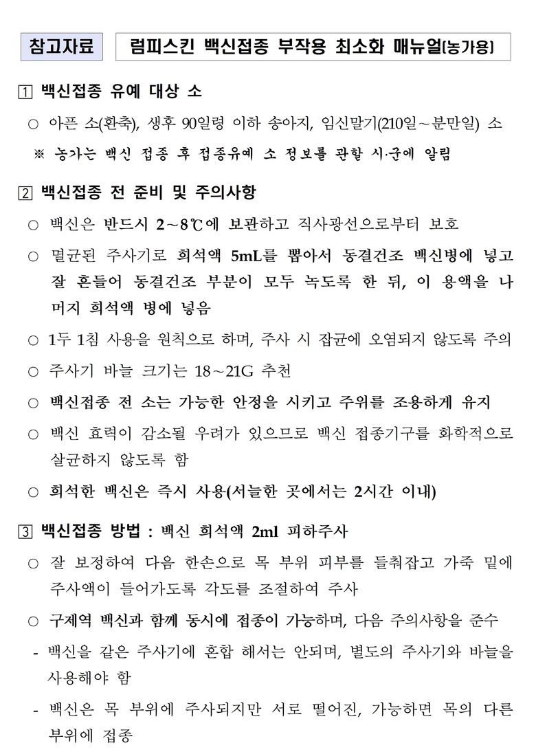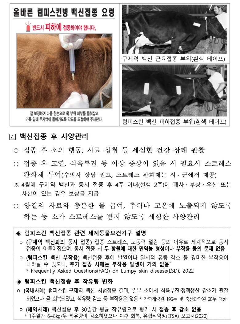 석성균 강원특별자치도 농정국장은 “기온 상승에 따른 매개체(모기, 흡혈파리 등) 활동 시기가 도래하면서 럼피스킨 발생 위험이 높아지고 있는 만큼, 사전예방을 위해 사육 소에 대한 철저한 백신 접종이 무엇보다도 중요하다”면서, “축산 농가에서는 시군, 축협 등 관계기관과 긴밀히 협조하여 이번 일제 백신접종이 꼼꼼히 완료될 수 있도록 적극 협조해 주시길 당부드린다”고 밝혔다.