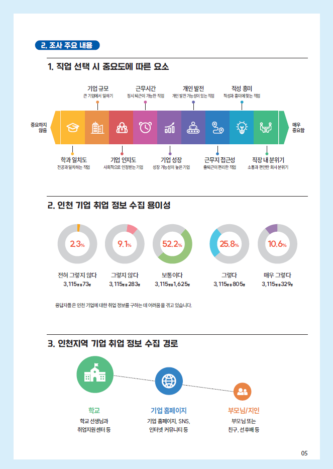 가이드북은 인천시와 중부지방고용노동청(청장 김윤태)이 공동으로 발간한 자료로, 인천지역 직업계 고등학교 학생 3,115명을 대상으로 실시한 실태조사를 바탕으로 제작되었으며, 직업 선택 시 중요하게 고려하는 요소와 인천지역 기업 취업 의향 등 청년들이 궁금해하는 기업 정보를 충실히 담았다.