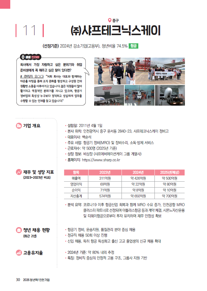 항공기 정비(MRO) 및 장비 수리 업체인 ㈜샤프테크닉스케이의 노동자는 “대표와 함께하는 타운홀 미팅을 통해 조직문화를 만들어가고 있으며, 젊은 직원이 많아 활기차고 역동적인 분위기가 강점”이라고 말했다.