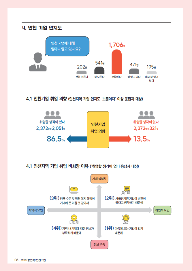 실태조사 결과, 인천지역 기업에 취업할 의향이 있다고 응답한 청년은 86.5%로 매우 높은 수준이었으나, 인천지역 기업에 대해 잘 알고 있다고 답한 비율은 21.4%에 그쳤다. 또한 다수의 청년이 취업 정보 탐색 과정에서 어려움을 겪고 있는 것으로 나타났다.