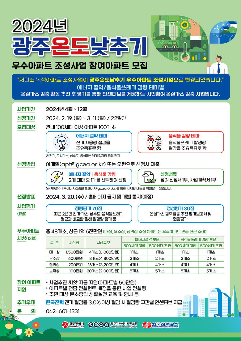손인규 기후대기정책과장은 “2045 광주 탄소중립 도시 실현을 위해서는 소수의 노력만으로는 불가능하며 시민이 적극적으로 동참하는 온실가스 감축 활동이 필요하다”며 “광주온도낮추기 우수아파트 조성 사업에 많은 참여를 바란다”고 말했다.
