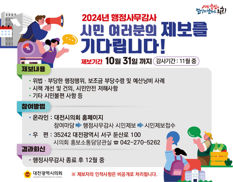 제보는 대전시의회 누리집(참여마당→행정사무감사 시민제보)에 올리거나 방문 및 우편(대전시 둔산로 100, 의회사무처 홍보소통담당관) 등을 통해 누구나 참여할 수 있다.