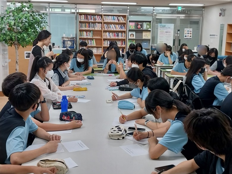 [광명시 세계타임즈=송민수 기자] 광명 소재 빛가온중학교(교장 한연희)는 지난 7월 5일 수요일, 동아리 시간을 활용하여 학교도서관에서 ‘글쓰기와 나를 둘러싼 관계를 사랑하는 일’을 주제로 청소년 소설가인 탁경은 작가를 만났다.