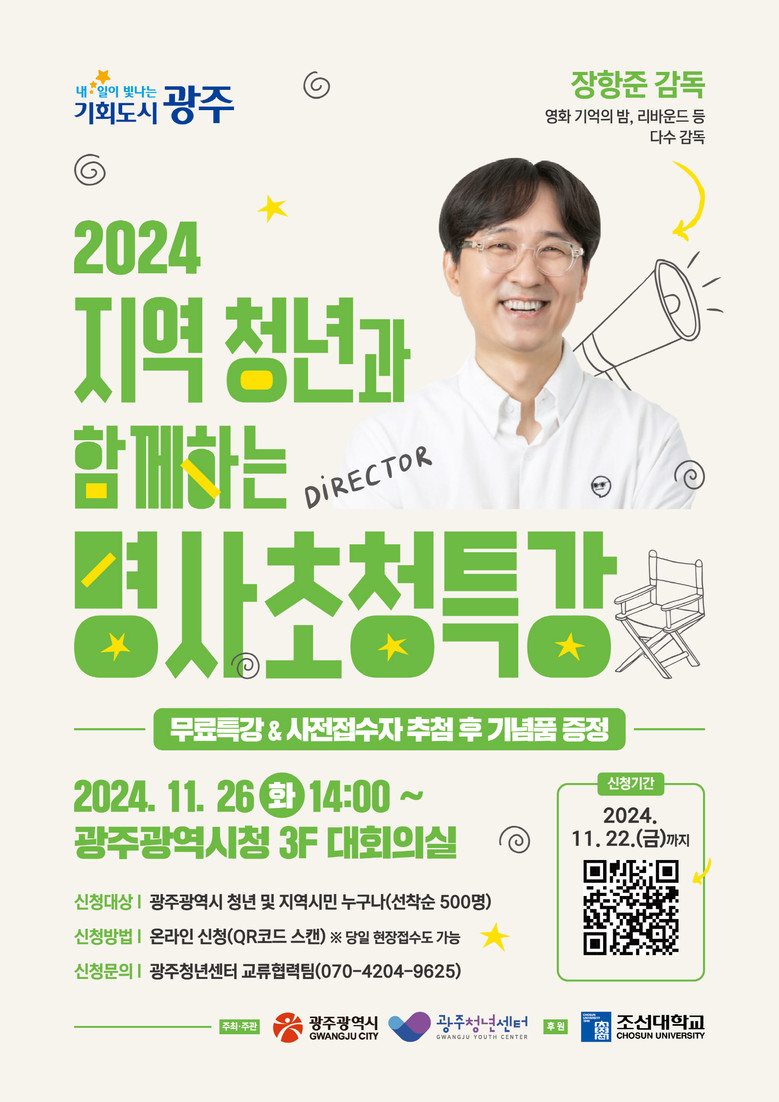 장 감독은 이번 특강에서 ‘창작의 사소한 이유’를 주제로 평범한 소년에서 창작자가 되기까지 여정을 소개하며 청년들에게 희망의 메시지를 전달할 계획이다.