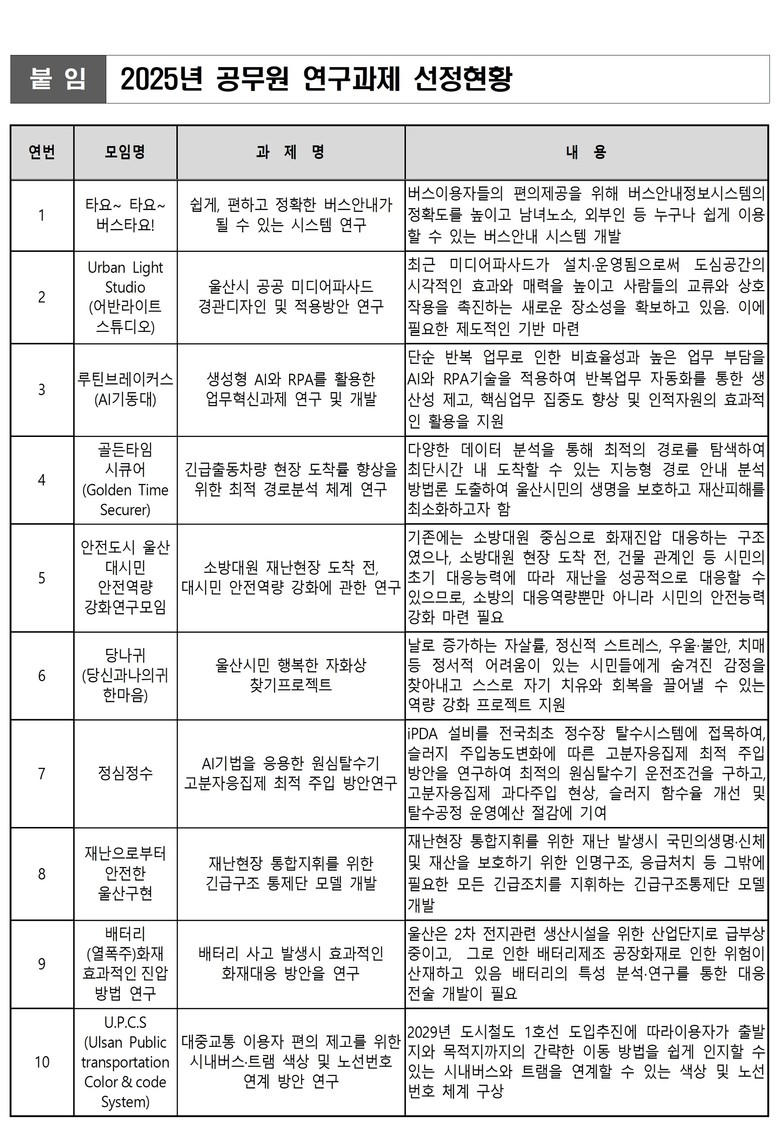 주요 과제로는 ▲쉽게, 편하고 정확한 버스 안내가 될 수 있는 체계(시스템) 연구 ▲울산시 공공 외벽 영상(미디어파사드) 경관디자인 및 적용 방안 연구 ▲생성형 인공지능(AI)과 로봇프로세스자동화(RPA)를 활용한 업무혁신과제 연구 및 개발 ▲긴급출동차량 현장 도착률 향상을 위한 최적 경로분석 체계연구 등이 있다.