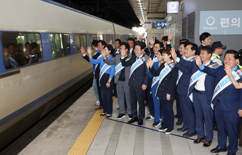 [세계타임즈 = 신상철 기자] 더불어민주당 이재명 대표와 박찬대 원내대표 등 의원들이 13일 오전 서울 용산역에서 추석 귀성 인사를 하고 있다. 2024.9.13 [공동취재]
