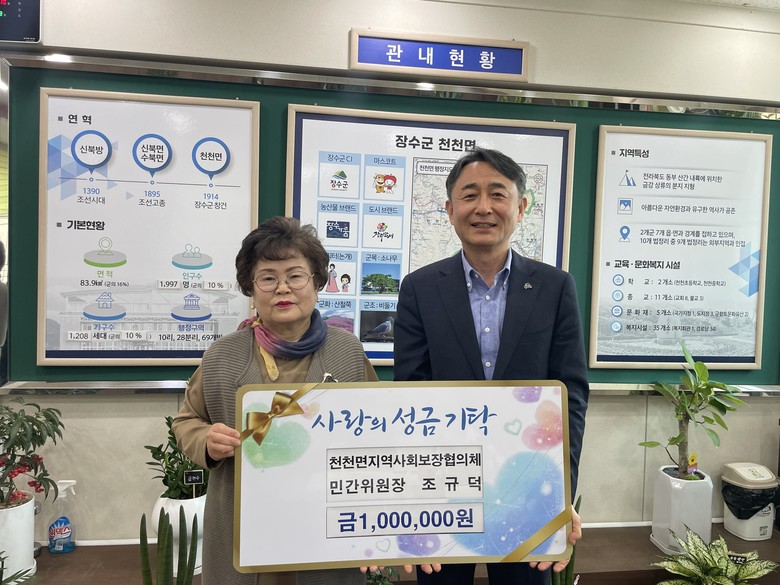 기부된 성금은 천천면 내 소외된 이웃을 지원하는 천천면 지역사회보장협의체 특화사업을 통해 위기 아동 30명에게 사용될 예정이다.