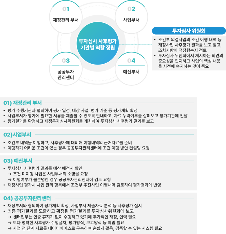 이 연구에서는 투자심사사업 사후평가 수행 방안으로, 정량적으로 단기간에 확인이 가능한 지표(예산반영률 등) 외에 세밀하게 장기간 검토해야 하는 지표(조건 이행률)도 사후평가 항목이므로, 투자심사를 담당하는 재정부서를 비롯하여 예산부서와 공공투자관리센터까지 각 기관별 역할을 제안하고 있다.