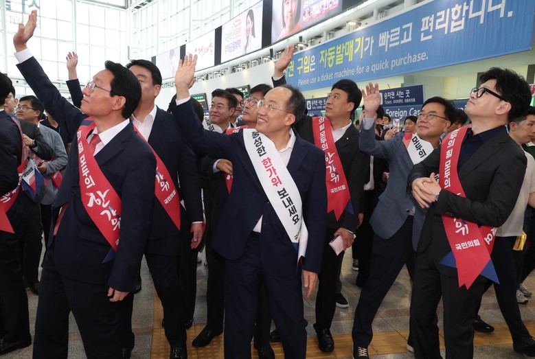 [세계타임즈 = 신상철 기자] 13일 오전 서울역 KTX 대합실에서 국민의힘 한동훈 대표와 지도부가 추석 귀성 인사를 하고 있다. 2024.9.13 [공동취재]