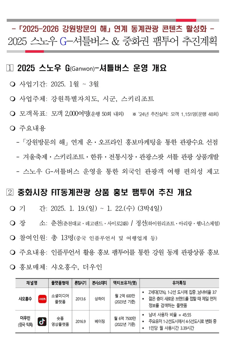 또한,「2025-2026 강원방문의 해」와 강원 동계관광을 연계한 온·오프라인 홍보마케팅을 위해 중화권 유명 온라인 플랫폼(샤오홍수·더우인) 인플루언서를 활용한 ‘중화권 외국인 개별관광객(FIT) 동계관광 상품 홍보 팸투어’를 실시하여, 강원 관광의 다채로운 매력을 알릴 예정이다.