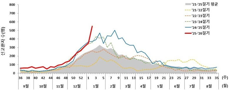 전국 장관감염증 표본감시 결과에 따르면 노로바이러스 환자 수는 지난해 11월 1주 차(2025년 45주)부터 지속적으로 증가해 올해 1월 2주 차 기준 548명으로 최근 5년 내 최고 수준을 기록했다. 특히 0~6세 영유아가 전체 환자의 39.6%를 차지해 가장 높은 비율을 보였다.
