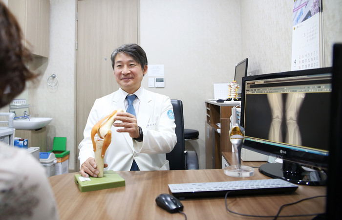 | ▲서동원 원장이 환자에게 무릎질환에 대해 설명하고 있다. |