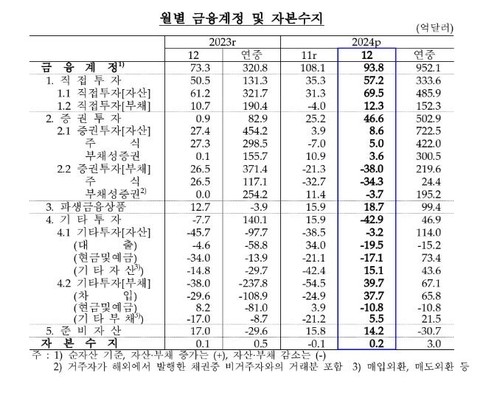 직접투자의 경우 내국인의 해외투자가 69억5천만달러 늘었고, 외국인의 국내 투자도 12억3천만달러 증가했다.증권투자에서는 내국인의 해외투자가 주식을 중심으로 8억6천만달러 증가하는 동안 외국인의 국내 투자는 주식 위주로 38억달러 감소했다.한은은 지난해 11월 경제전망 당시 올해 경상수지 흑자 규모를 800억달러로 예상했다. 이달 25일 수정 경제전망을 발표한다.신 국장은 "올해 경상수지 흐름에서 가장 중요한 리스크 요인은 미국 트럼프 정부의 통상 정책과 그에 대한 주요국 반응"이라며 "시기와 강도를 계속 점검해야 한다"고 말했다.1월 통관 기준 무역수지가 적자로 돌아섰지만, 경상수지까지 적자를 기록할 것 같지는 않다"고 덧붙였다.