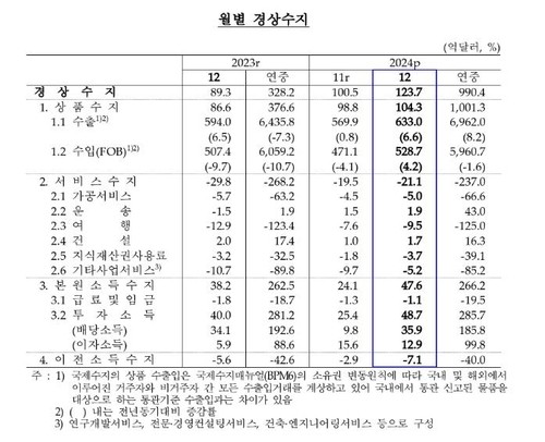 12월 경상수지를 항목별로 보면, 상품수지 흑자(104억3천만달러)가 전년 12월(86억6천만달러)이나 전월(98억8천만달러)과 비교해 모두 늘었다.수출(633억달러)은 1년 전보다 6.6% 늘었다. 반도체 등 정보기술(IT) 품목 증가세가 이어지고 승용차·화학공업제품 등 비IT 품목의 감소세가 둔화하면서 수출 증가율이 11월(0.8%)보다 높아졌다.품목 중에서는 통관 기준으로 정보통신기기(37.0%)·반도체(30.6%)·철강제품(6.0%)이늘었고, 지역별로는 동남아(15.4%)·EU(15.2%)·중국(8.6%)·일본(6.1%)·미국(5.5%) 대상 수출이 모두 호조를 보였다.수입(528억7천만달러)은 4.2% 불었다. 원자재 수입(-9.6%)은 줄었지만 자본재(24.4%)·소비재(1.2%) 등을 중심으로 3개월 만에 증가세로 돌아섰다.품목별로는 가스(-26.6%)·원유(-23.3%)·석탄(-10.6%) 등이 뒷걸음쳤고, 반대로 수송장비(59.2%)·반도체제조장비(42.6%)·비내구재소비재(7.5%) 등의 수입은 늘었다.