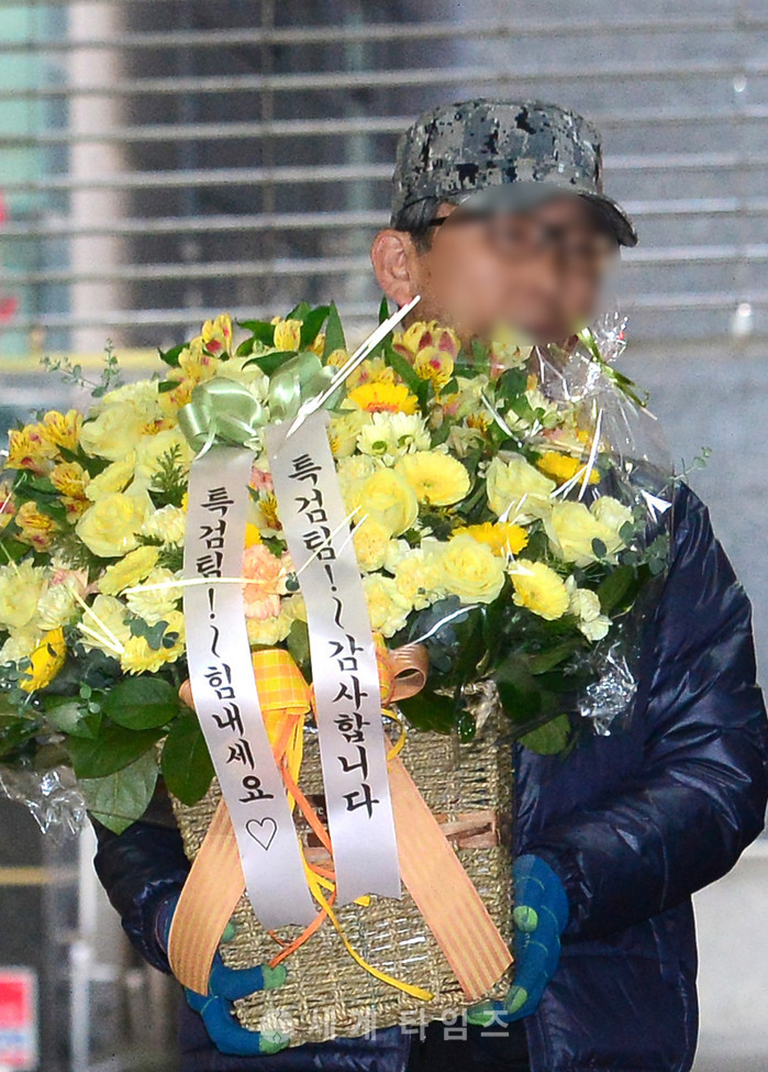 21일 오전 서울 강남구 대치동 특별검사 사무실로 특검팀을 응원하는 꽃바구니가 배달되고 있다. 2017.02.21.