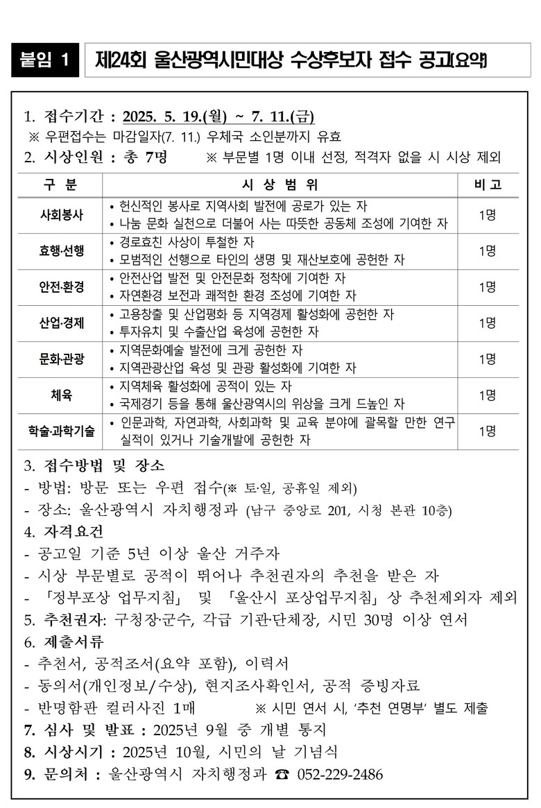 추천 대상은 부문별 울산시 위상을 제고하거나 발전에 기여한 자로 공고일(2025년 5월 19일) 현재 5년 이상 계속해서 울산시에 거주하고 있는 시민이면 가능하다.