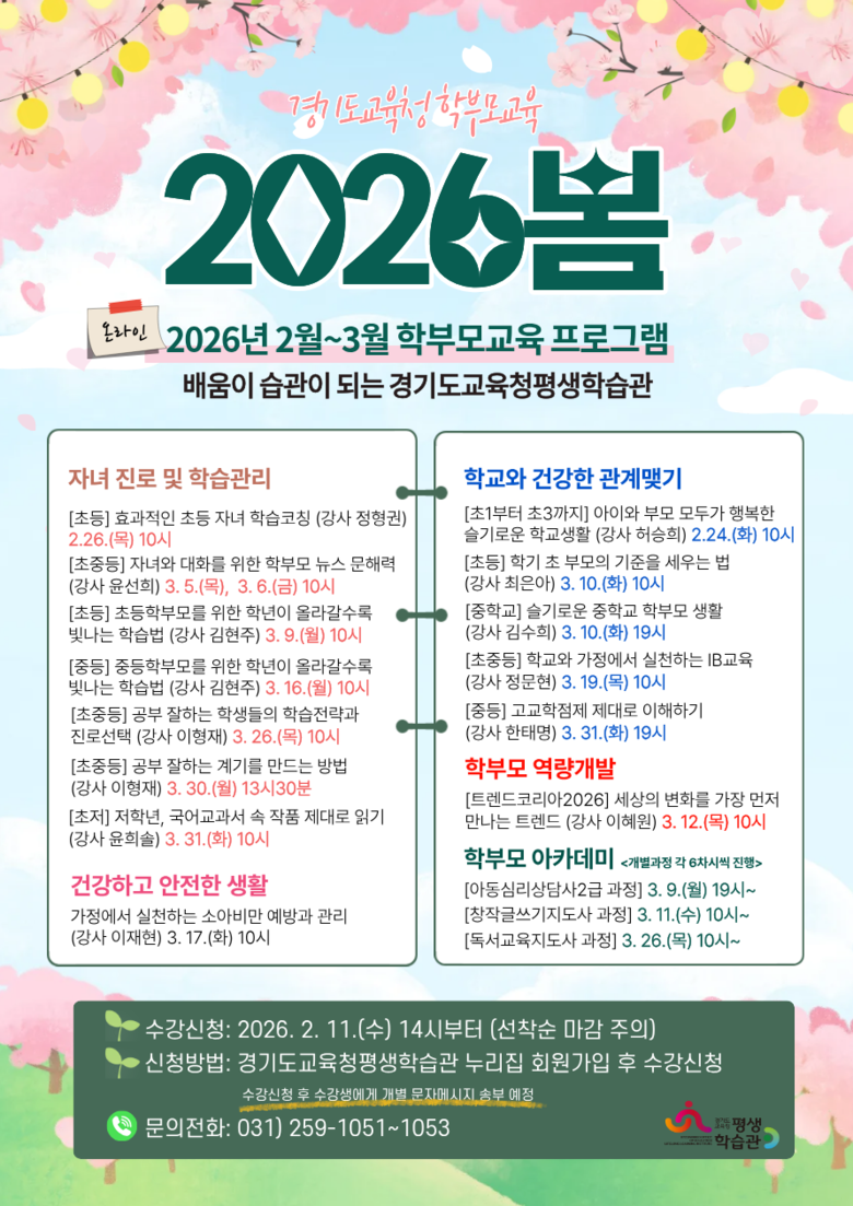 류영신 경기도교육청평생학습관장은 “2025년 지역과 학교로 찾아가는 학부모교육과 온라인 교육에 약 7만 5천여 명의 학부모님이 함께했다”며 “2026년에도 경기교육정책에 기반하여 학생ㆍ학부모 수요 맞춤형 프로그램을 적극적으로 추진하겠다”고 말했다.