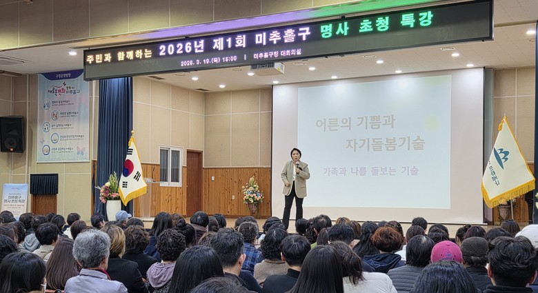 [미추홀구 세계타임즈=심하린 기자] 인천 미추홀구(구청장 이영훈)는 지난 19일 구청 대회의실에서 주민 360여 명을 대상으로 ‘2026년 제1회 미추홀구 명사 초청 특강’을 개최했다.
