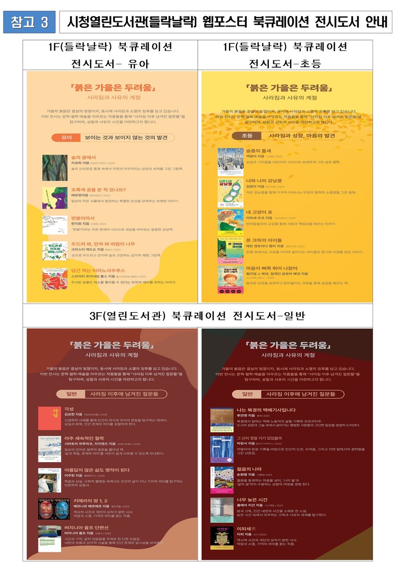 김귀옥 시 청년산학국장은 “이번 전시는 책을 단순한 읽기의 매체를 넘어, 가을 특유의 깊은 사유와 성찰의 향기를 머금은 문화의 장으로 확장하는 계기가 될 것”이라며, “시민들이 계절의 변화 속에서 자연스레 도서관을 찾고, 책을 통해 가을처럼 깊고 따뜻한 위로와 사유를 경험하기를 바란다”라고 말했다.
