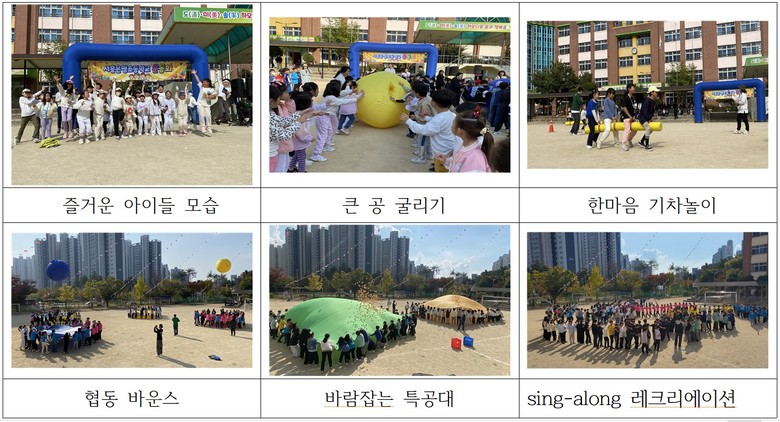 ‘으랏찻차 신나고 행복한 놀이 한마당’ 행사는 학년군별로 맞춤형 놀이 및 레크리에이션 프로그램으로 다양하게 진행되었다. 1-2학년군에서는 20-30명의 학생이 협동하여 공중에 걸린 바구니에 볼풀공을 던져 넣는 ‘볼풀공 넣고 던지기’와 청백으로 나뉘어 큰 공을 굴리는 ‘큰 공 굴리기’가 가장 인기 있었다. 3-4학년 군에서는 청백으로 나뉘어 줄다리기 줄을 먼저 많이 가져가는 팀이 이기는 ‘전략 줄다리기’와 기차를 타고 반환점을 돌아오는 ‘한마음 기차놀이’가 거꾸로 타고 가는 재미있는 모습을 보여 가장 인기가 있었다. 또한 5-6학년 군에서는 50명 정도의 학생들이 커다란 천을 이용하여 협동하여 공기를 채우고 미션으로 인원을 제거해가며 공기를 제거하거나 공을 먼저 떨어뜨려 승패를 가르는 ‘바람잡는 특공대’와 ‘협동 바운스’ 놀이를 가장 즐거워하였다. 놀이를 마친 후 마지막으로 진행된 학년군별 ‘sing-along 레크리에이션’은 반별 모이기, 다른 반 친구와 삼삼오오 모이기, 큰 원, 작은 원, 기차 행진 등을 통해 학생들이 다양한 구성원들과 어울리며 얼굴을 가까이하고 손을 맞잡고 존중과 배려하는 마음을 나누며 즐겁게 소통하였다.