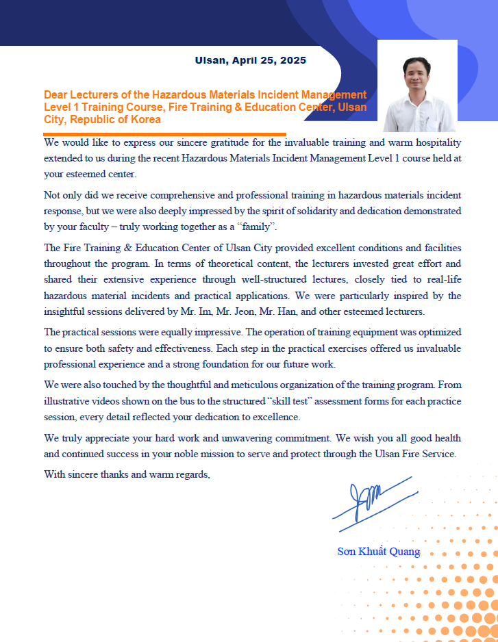 교육에 참여한 베트남 소방대학 ‘선 쿠엇 꽝(Son Khuat Quang)’ 교수는 교육과정을 마친 뒤, 체계적이고 전문적인 교육 훈련 프로그램과 열정적이고 헌신적인 교관들에게 깊은 감명을 받았다며 감사의 마음을 담은 편지를 지난 4월 25일 특수재난훈련센터로 보내왔다.
